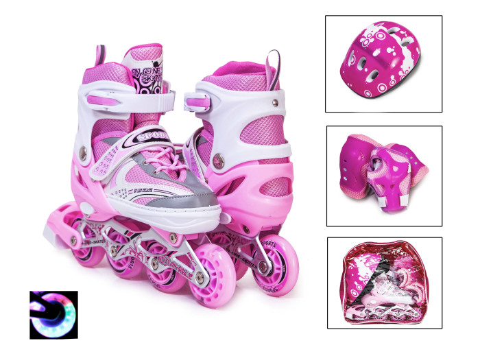 Scale Sports Happy - це відмінний набір із роликів та захисту для найменших дітей, які хочуть спробувати себе у цьому чудовому виді спорту. Конструкція роликів дозволяє змінювати розмір, під розмір стопи. Рама роликових ковзанів виконана з алюмінієвого металу, відповідно дуже надійна. Черевик виготовлений з ударостійкого пластику із зовнішнього боку, і приємного матеріалу, що дихає зсередини. Варто пам'ятати, що захист, особливо для найменших це дуже важливий момент. У наборі є все необхідне – шолом, захист для колін та ліктів. Дані роликові ковзани - чудовий подарунок для дітей.