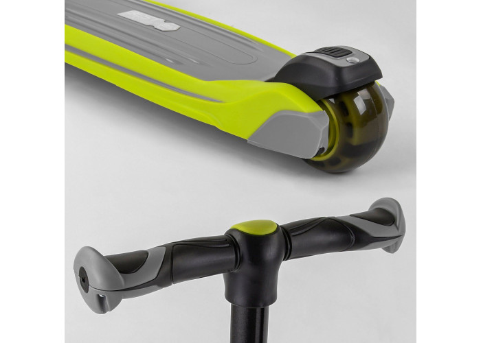 Конструкція самоката складається з трьох коліс - два передніх і одне заднє широке колесо. За рахунок матеріалу з якого виготовлені колеса даної моделі - поліуретан - самокат безшумний, а їзда на ньому м'яка і комфортна. Всі колеса під час руху світяться різними кольорами.