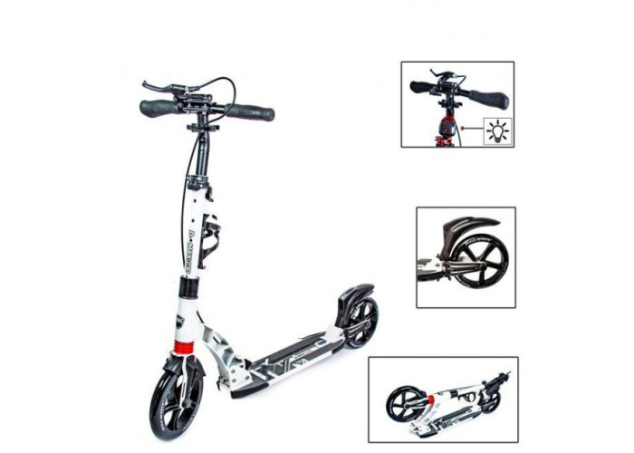 Самокат Scale Sports D-Max 230 з Ручним Гальмом - модний і стильний міський самокат на амортизаторах і з ручним гальмом, що витримує великі навантаження, з надійною і простою системою складання. У даній моделі є ліхтарик на сонячній батареї!