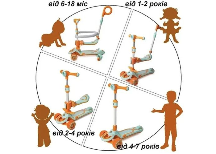 - Зможете використовувати його в різних режимах, починаючи з перших кроків і до моменту, коли ваша дитина впевнено кататиметься на самокаті.