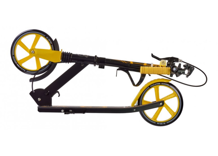 Самокат Maraton RIDER Light Wheel важить всього - 5 кг. Вага порівняно невелика, тому що рама виконана з алюмінію — міцна і водночас легка. Конструкція самокату витримує навантаження до 100 кг. Самокат легко складається та зручний для зберігання та транспортування. Ви без проблем зможете брати його із собою у громадський транспорт.