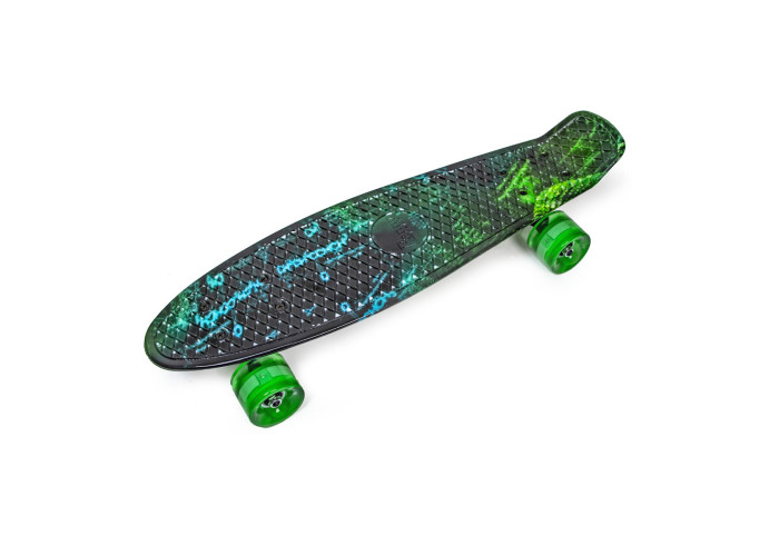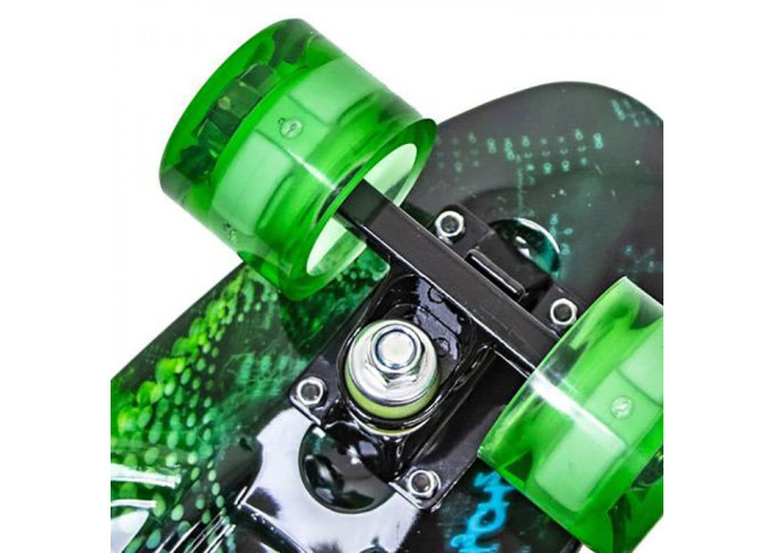 Ультра-модний Penny Board "Сhemistry" з колесами, що світяться - кращий вибір для стильної і сучасної молоді. Верх деки забезпечує відмінне зчеплення з ногою, а дека шириною 15 см відмінно підійде для новачків. Підшипник ABEC-7 Chrome і поліуретанові колеса забезпечать безшумне пересування.