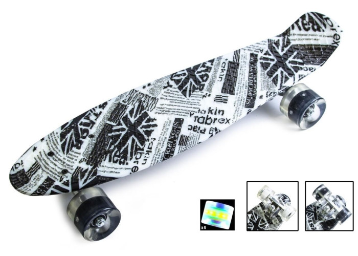 Ультра-модний Penny Board "Street Newspaper" з колесами, що світяться - кращий вибір для стильної і сучасної молоді. Верх деки забезпечує відмінне зчеплення з ногою, а дека шириною 15 см відмінно підійде для новачків. Підшипник ABEC-7 Chrome і поліуретанові колеса забезпечать безшумне пересування.