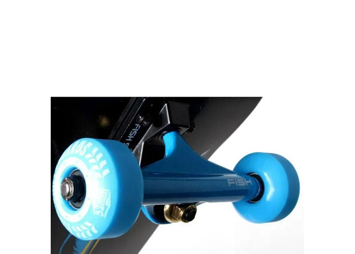 - безпечна експлуатація і рівновага вироби полягають в наждачному покритті, яке вберігає від падіння в процесі руху. Підвіска з алюмінієвого сплаву забезпечує довготривалість обороту. Чотири коліщатка міцно тримають основу, а товщина скейтборду в 10 см не допускає ймовірність поломки під час активного використання;