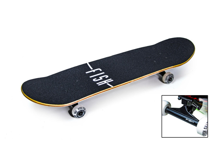 Просте і одночасно оригінальне оформлення скейта FISH "SNAKE SKIN" зробить власника впізнаваним. Брутальний чорний верх і оригінальний малюнок внизу приведуть в захват любителів скейтбордингу. Модний аксесуар для вуличного спорту стане відмінним помічником для поліпшення координації та вирівнювання постави.