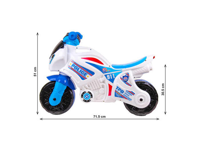 Кожен малюк хоче відчути себе справжнім героєм. Бути поліцейським – це так почесно! Для наших маленьких патрульних ми розробили спеціальний транспорт – біговел мотоцикл від ТехноК. Байк білого кольору з яскравими поліцейськими наклейками стане улюбленою іграшкою ваших дітей.