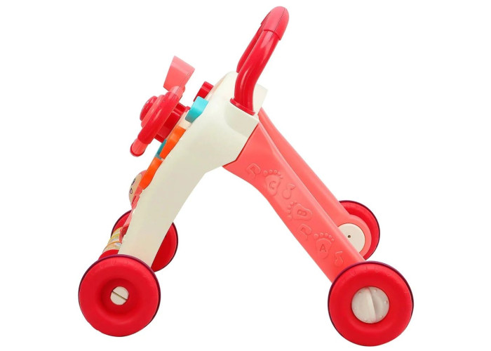 Крім підтримки перших кроків за допомогою зручної конструкції з ручкою та прогумованими коліщатками, швидкість яких можна регулювати, малюки зможуть насолодитися веселими іграми. Так, зокрема, в центрі є сортер із фігурками різних форм та кольорів, колесо з картинками, музичний джойстик із веселими мелодіями та забавними звуками, які розвеселять малюка.З іншого боку ходунків у малюка буде власне кермо зі звуковими сигналами, пищалкою, світловими ефектами та мелодіями.