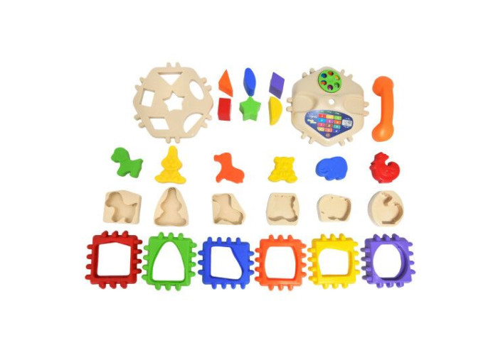 Іграшка складається із телефонної трубки, циферблату, 6-ти бічних сторін з фігурами різної форми, в які вставляються фігурки тварин та стінки з отворами різної форми для 6-ти геометричних фігур.