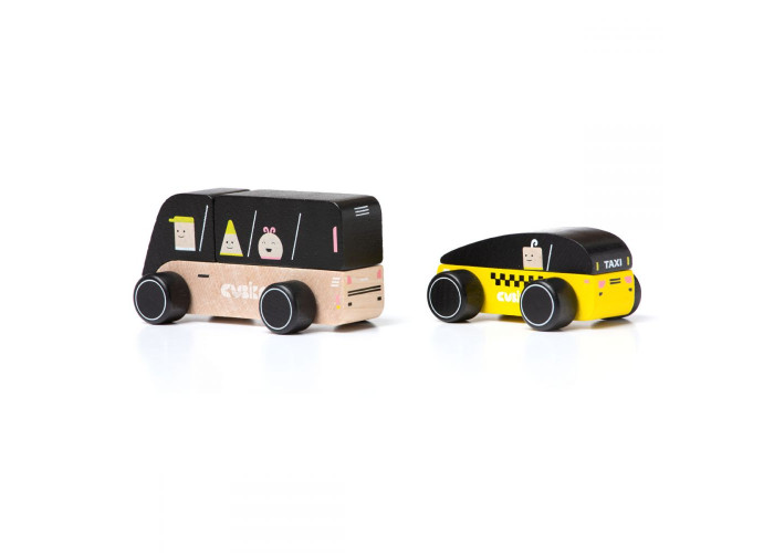 - Дерев'яний розвиваючий Набір "Міський транспорт" Левеня Cubika складається з автобусу та таксі.