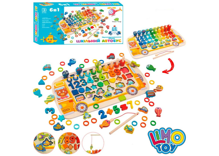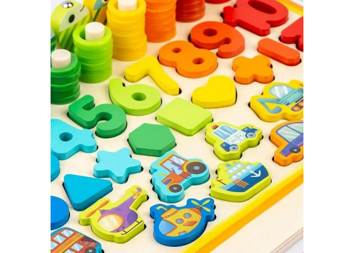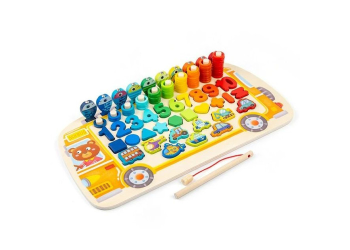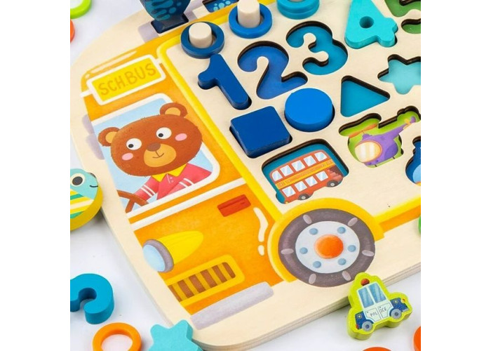 Розвиваюча дошка - сортер Автобус перетворить вивчення основ арифметики на справжню веселу гру. Модель відрізняється чудово опрацьованим дизайном, контрастні кольори гармонійно переплітаються з малюнками різної тематики та створюють справжню феєрію кольору.