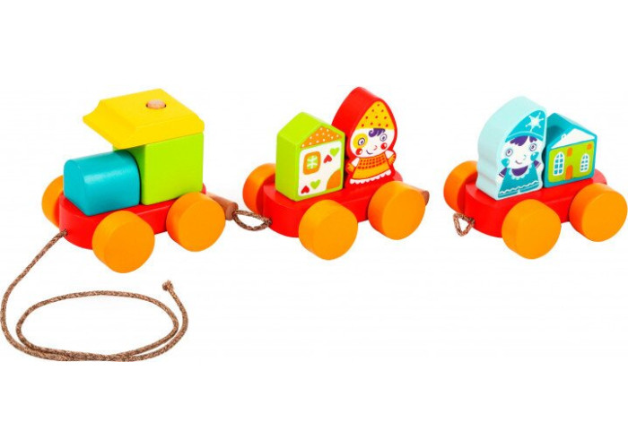 Поезд-сортер с подвижными колесами, на котором размещены разноцветные гномы и домики