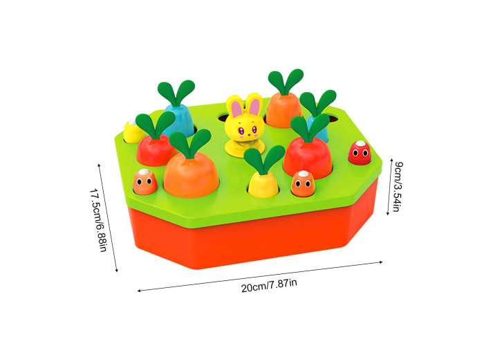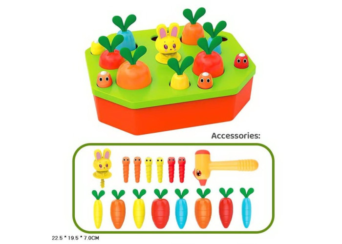 Універсальна іграшка з багатьма іграми, які прекрасно допоможуть в розвитку дрібної моторики, координації рухів. У даній грі виловлюємо зі ставка рибки вудками, садимо морквинки на грядці, і стежимо за Гусеничками, щоб не пошкодили врожай. Як тільки з'явилися гусенички відразу ж їх виловлюємо за допомогою щипців або магнітної вудки. Для кожної морквини на грядці є своє місце, знайди його і посади морквину. За допомогою щипців можна садити і виймати морквину з комірок.