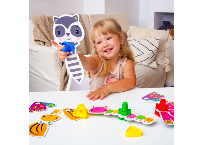 Візьміть болтики та зберіть за допомогою них звірят. Щоб закріпити всі деталі, прикрутіть зверху гайки. Коли малюк закінчить, він зможе ворушити хвостиком чи крильцями. Усі деталі двосторонні, з кожного боку зображено окрему тварину.