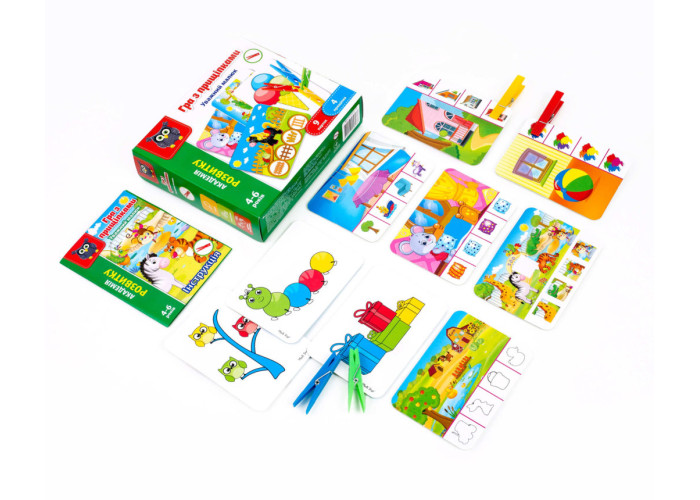 Комплектація: 4 прищіпки (червона, зелена, блакитна, жовта), 9 карток, інструкція.