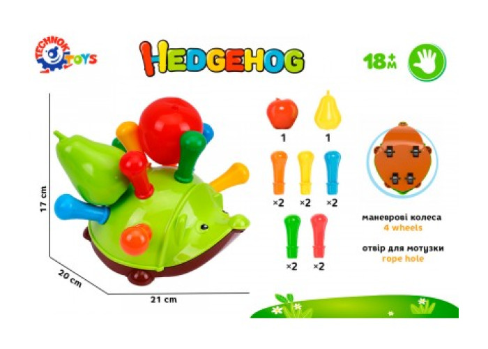 Новинка від ТехноК "Їжачок"-відповідає всім вимогам якісної та корисної іграшки. Набір складається з яскравого їжака, 10 кольорових голок, яблучка та груші. Всі елементи можна використовувати для веселих ігор та розвивальних вправ.