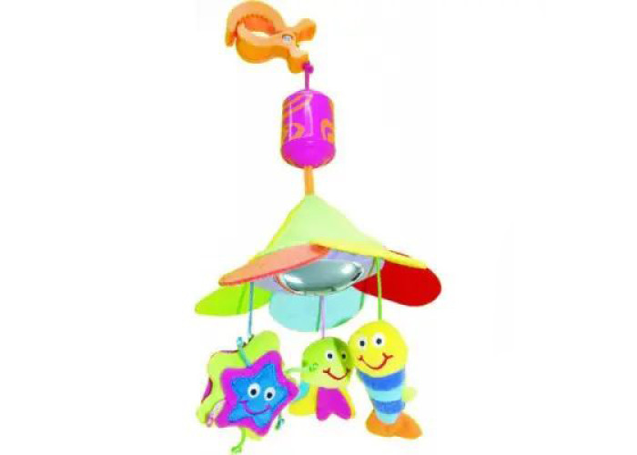 буде крутитися із застосуванням сили, є 4 іграшки (совеня-брязкальце, квітка-дзеркальце, м'який м'ячик і колечко з гризунком)