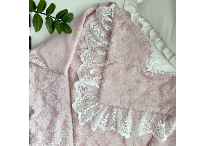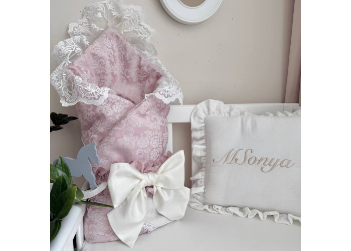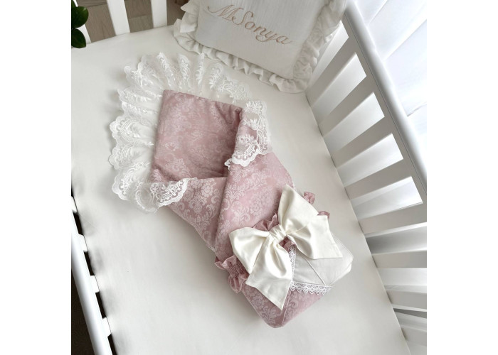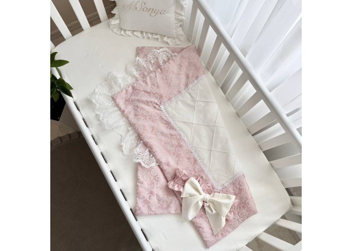 Дитячий плед-конверт з мереживом, виготовлений із поєднанням жаккардової тканини та сатину, 100% бавовняного матеріалу.Наповнювач: силіконізоване волокно. Бантик входить у комплектацію. На дотик - це рельєфний, м'який і досить щільний виріб.