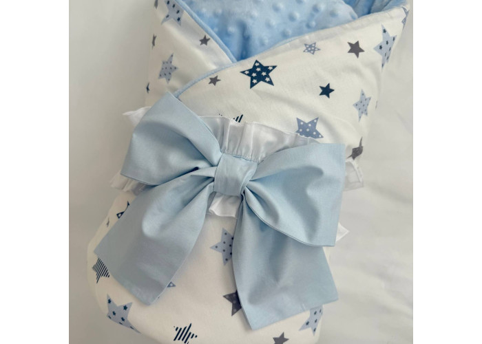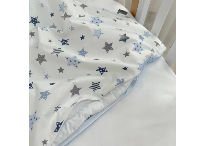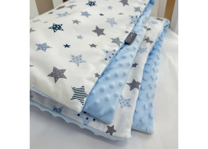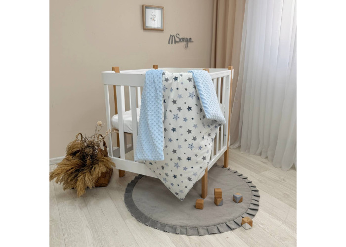 Дитячий двосторонній плед-конверт з ковдрою всередені, яка виймається при необхідності. Виріб складається з двох частин: плед на блискавці, з одного боку виготовленого з попліну, з іншого – з плюшу Minky, та ковдри з мікрофібри, наповнювач ковдри - штучний лебединий пух. На дотик-це рельєфний, м'який і досить теплий і щільний виріб.