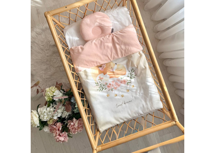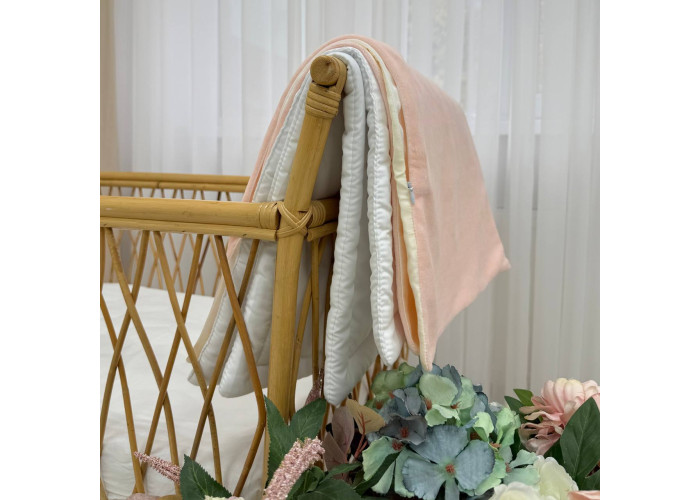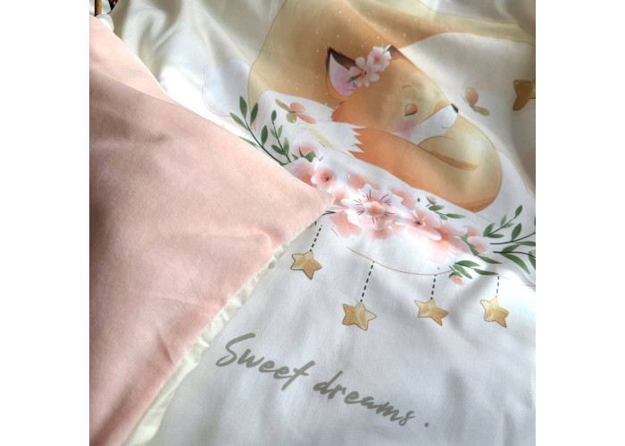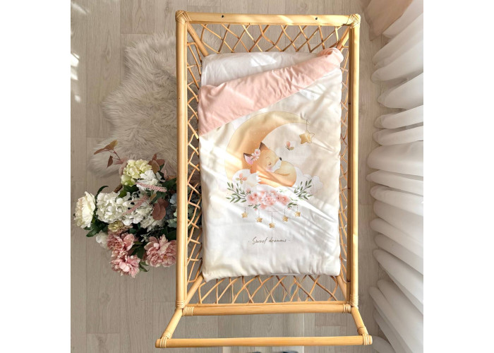 Дитячий двосторонній плед-конверт на блискавці, з ковдрою всередені, яка виймається при необхідності. Виріб складається з двох частин: плед на блискавці, з одного боку виготовленого з сатину, з іншого – з велюру, всередені ковдра, пошита з мікрофібри, наповнювач - штучний лебединий пух. На дотик це -рельєфний, м'який і досить теплий і щільний виріб.