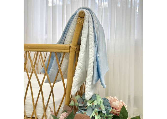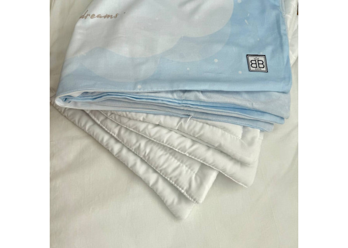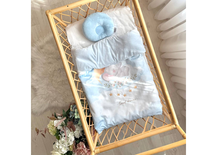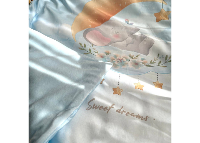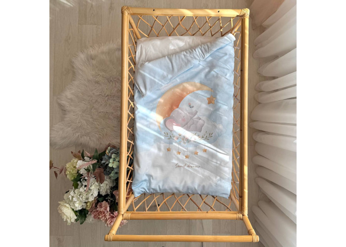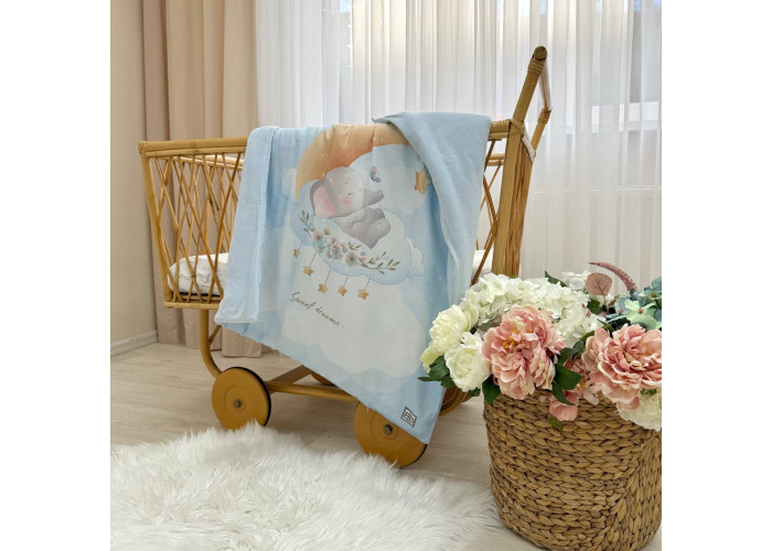 Дитячий двосторонній плед-конверт на блискавці, з ковдрою всередені, яка виймається при необхідності. Виріб складається з двох частин: плед на блискавці, з одного боку виготовленого з сатину, з іншого – з велюру, всередені ковдра, пошита з мікрофібри, наповнювач - штучний лебединий пух. На дотик це -рельєфний, м'який і досить теплий і щільний виріб.