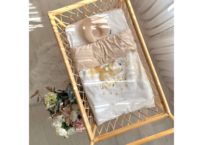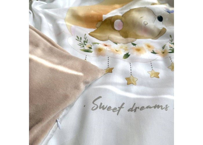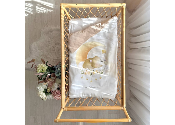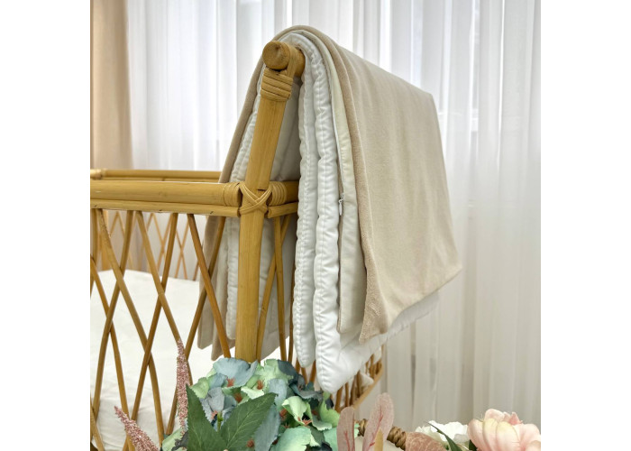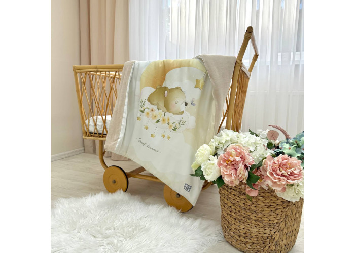 Дитячий двосторонній плед-конверт на блискавці, з ковдрою всередені, яка виймається при необхідності. Виріб складається з двох частин: плед на блискавці, з одного боку виготовленого з сатину, з іншого – з велюру, всередені ковдра, пошита з мікрофібри, наповнювач - штучний лебединий пух. На дотик це -рельєфний, м'який і досить теплий і щільний виріб.