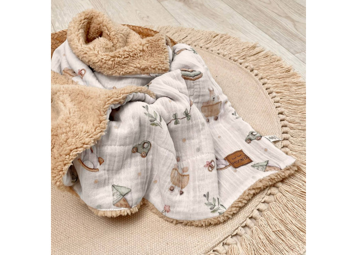 Дитячий утеплений плед підійде для діток від народження до 3-х років. З одного боку - мусліновий плед, з іншого - хутряна підкладка Тедді, що робить його м'яким і приємним на дотик. Його можна скласти в конверт, закутати малюка, використовувати в дитячому ліжечку, як додаткову ковдрочку. Вкривати немовля в візочку, під час прогулянок або в автомобілі.