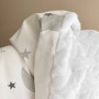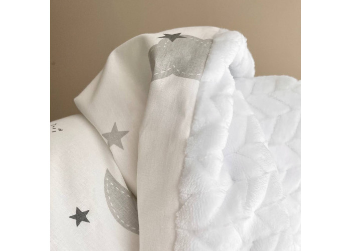 Дитячий двосторонній плед-конверт з ковдрою всередені, яка виймається при необхідності. Виріб складається з двох частин: плед на блискавці, з одного боку виготовленого з попліну, з іншого – з плюшу Minky, та ковдри з мікрофібри, наповнювач ковдри - штучний лебединий пух. На дотик-це рельєфний, м'який і досить теплий і щільний виріб.