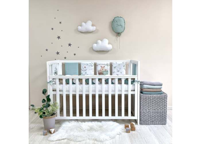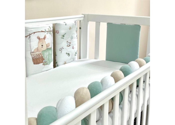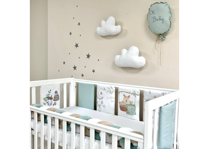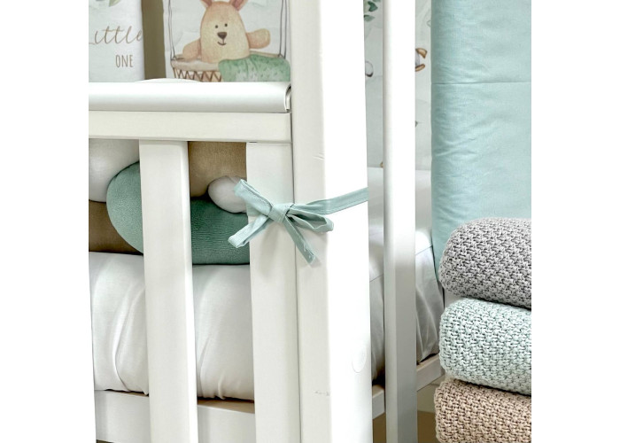 Бортики та простирадло, пошиті з польського попліну. Простирадло на гумці ідеально повторює форму матраца в ліжку. Ecotton – екологічно чистий, гіпоалергенний наповнювач, створений на основі натуральних бавовняних волокон. Ecotton soft полегшений та вдосконалений спеціально для виготовлення ковдр та подушечок у ліжечко, на базі основних норм та вимог до постільних речей для новонароджених.Набір запакований у прозору каркасну валізу з ручками.