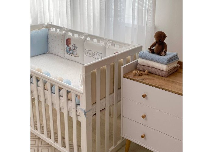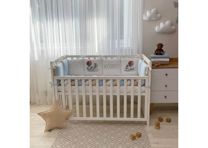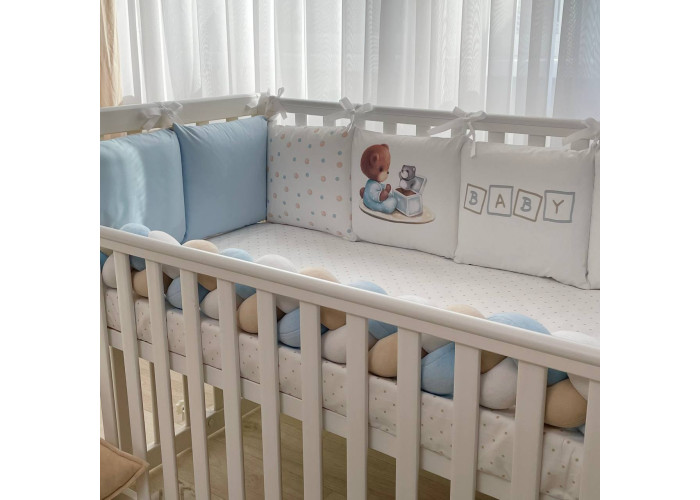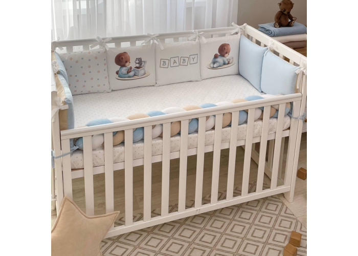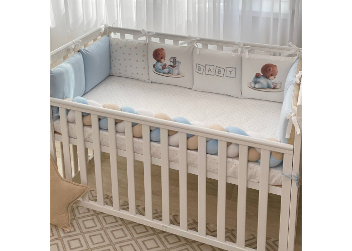 В комплект входить:Захист з подушечок на блискавці: 8 штук 30 х 32 см., 1 штука бортик-Бортик-коса 120 х 17 +/- 3 см. Простирадло на гумці, 120 Х 60 Х 15 см.