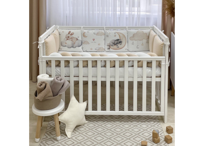 В комплект входить:Захист з подушечок на блискавці: 8 штук 30 х 32 см., 1 штука бортик-Бортик-коса 120 х 17 +/- 3 см. Простирадло на гумці, 120 Х 60 Х 15 см.