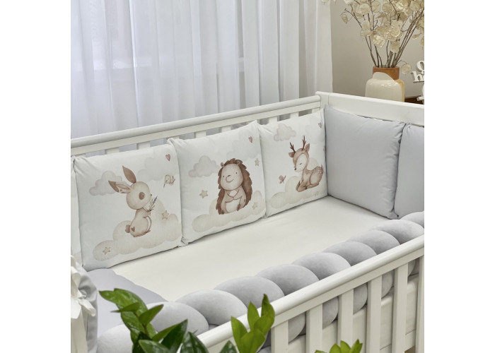 В комплект входить:Захист з подушечок на блискавці: 8 штук 30 х 32 см., 1 штука бортик-Бортик-коса 120 х 17 +/- 3 см. Простирадло на гумці, 120 Х 60 Х 15 см.