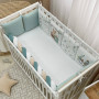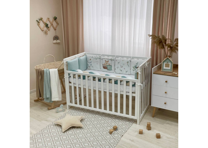 В комплект входить:Захист з подушечок на блискавці: 8 штук 30 х 32 см., 1 штука бортик-Бортик-коса 120 х 17 +/- 3 см. Простирадло на гумці, 120 Х 60 Х 15 см.