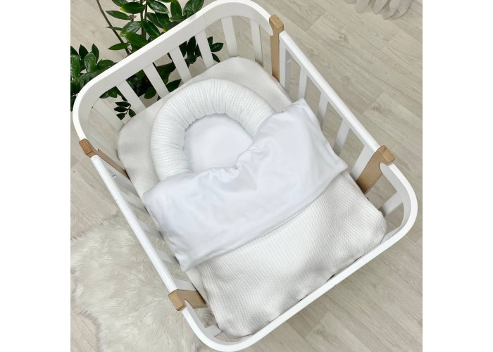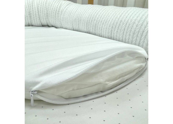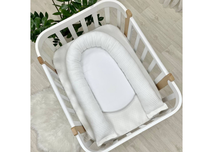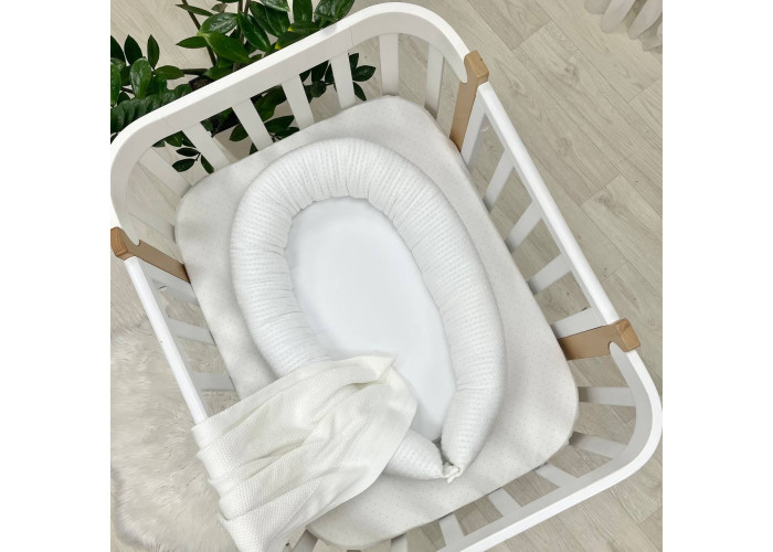 Кокон DreamLand - це невеликий, ергономічний, плоский матрац з м'якими обмежувальними бортиками із трикотажної тканини "косичка" по всьому периметру заввишки 10 см. Матрацик пошитий із сатину (100% бавовна). Наповнювач матраца - піна, пружний, сучасний, модифікований матеріал, який рівномірно розподіляє навантаження, завдяки чому малюк почуває себе затишно і комфортно. Чохол матраца пошитий з мікрофібри. Наповнювач для бортиків - силіконізоване волокно. Бортики фіксуються за допомогою кнопок.