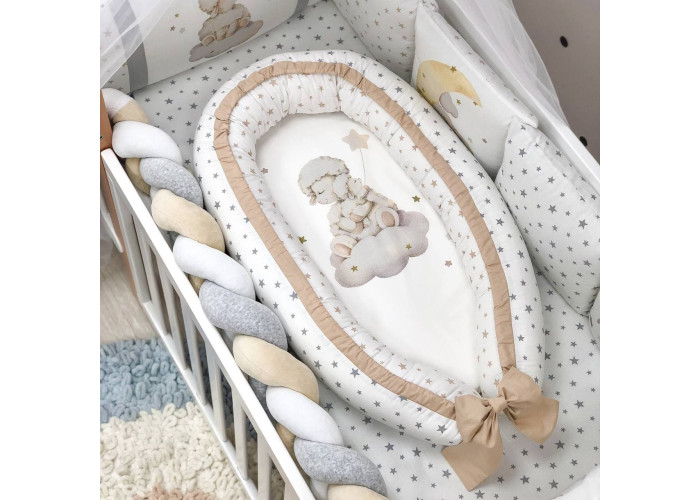 Гніздечко-кокон-це невеликий, ергономічний, плоский матрац з м'якими обмежувальними бортиками из попліна по всьому периметру заввишки 15 см. Наповнювач матраца - піна, пружний, сучасний, модифікований матеріал, який рівномірно розподіляє навантаження, завдяки чому малюк почуває себе затишно і комфортно. Кокон повністю розбірний. З'ємний чохол матрацика пошитий із непромокаючої тканини. На матрацику одягнене простирадло на гумці. Бортики виймаються з чохла для зручнішого прання. Наповнювач для бортів – силіконізоване волокно.