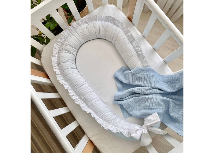 Наповнювач матраца - піна, пружний, сучасний, модифікований матеріал, який рівномірно розподіляє навантаження, завдяки чому малюк почуває себе затишно і комфортно. Чохол матраца пошитий з мікрофібри. Бортики можна стягнути спеціальною ниткою, яка вже вшита в кокон і зафіксувати бантом, таким чином можна зменшувати, або збільшувати розмір кокона-гніздечка.
