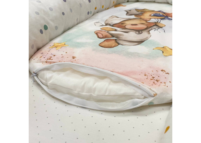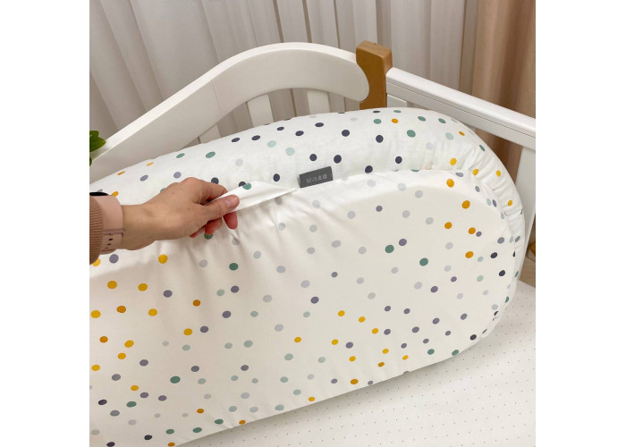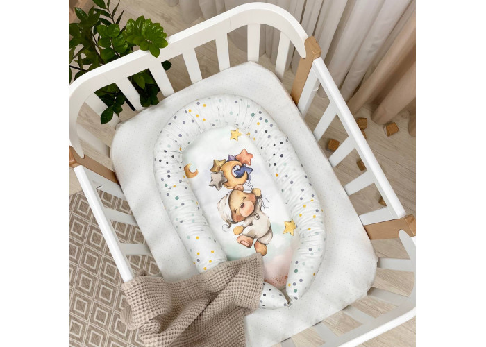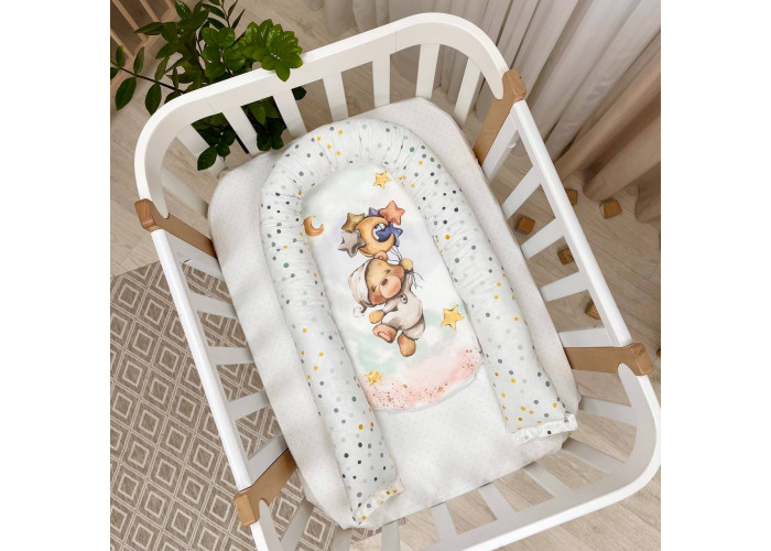 Гніздечко-кокон-це невеликий, ергономічний, плоский матрац з м'якими обмежувальними бортиками по всьому периметру заввишки 10 см. Наповнювач матраца - піна, пружний, сучасний, модифікований матеріал, який рівномірно розподіляє навантаження, завдяки чому малюк почуває себе затишно і комфортно. Чохол матраца пошитий з мікрофібри. Бортики можна стягнути спеціальною ниткою, яка вже вшита в кокон і зафіксувати бантом, таким чином можна зменшувати, або збільшувати розмір кокона-гніздечка.