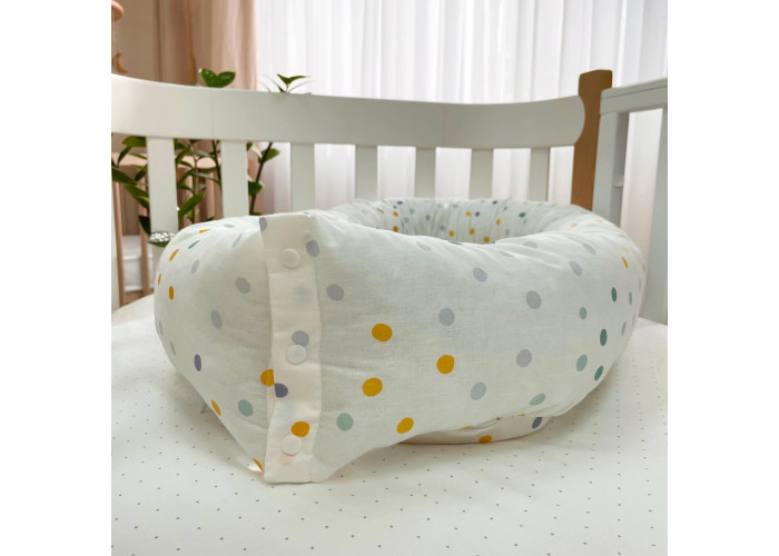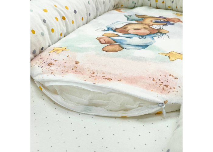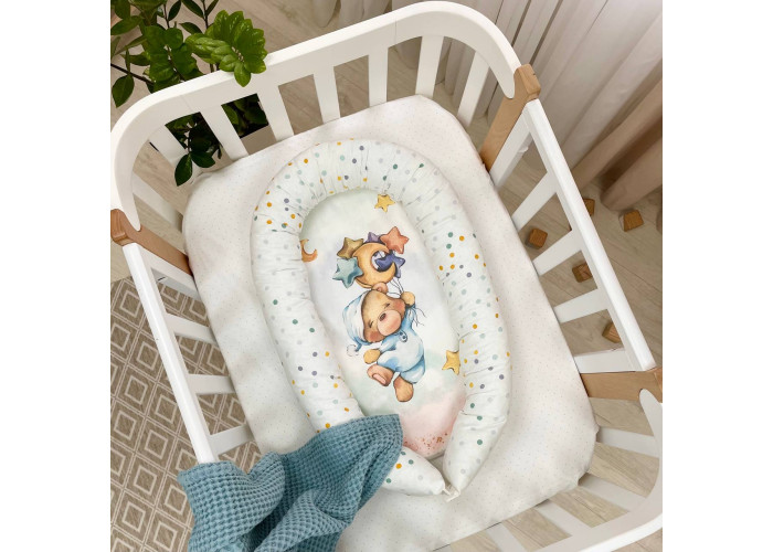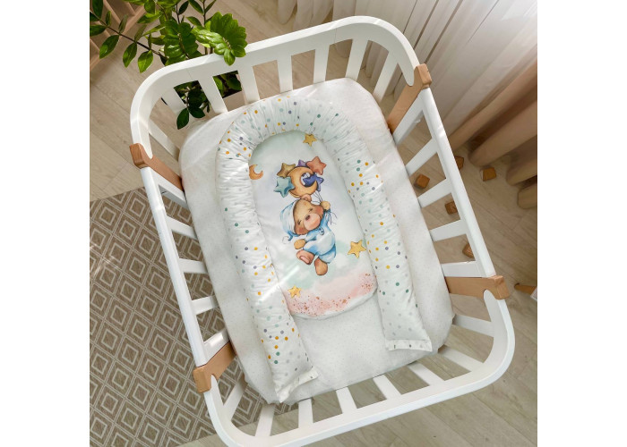 Гніздечко-кокон-це невеликий, ергономічний, плоский матрац з м'якими обмежувальними бортиками по всьому периметру заввишки 10 см. Наповнювач матраца - піна, пружний, сучасний, модифікований матеріал, який рівномірно розподіляє навантаження, завдяки чому малюк почуває себе затишно і комфортно. Чохол матраца пошитий з мікрофібри. Бортики можна стягнути спеціальною ниткою, яка вже вшита в кокон і зафіксувати бантом, таким чином можна зменшувати, або збільшувати розмір кокона-гніздечка.