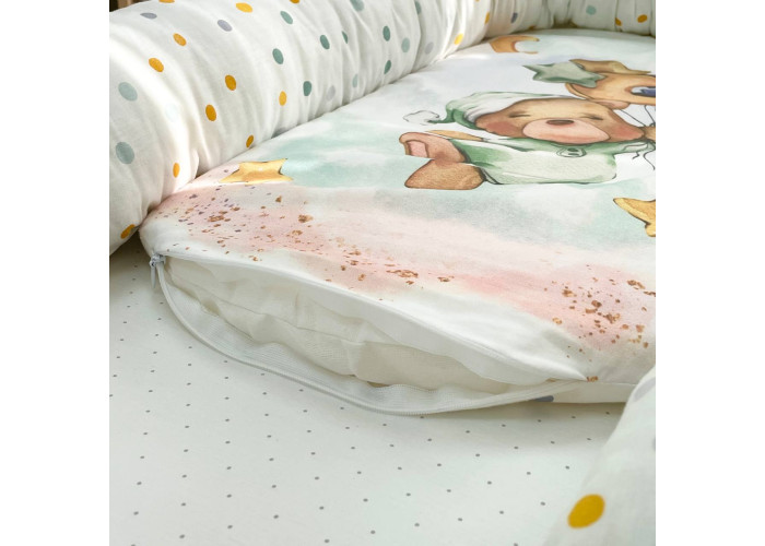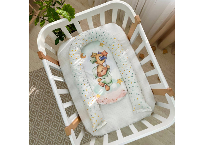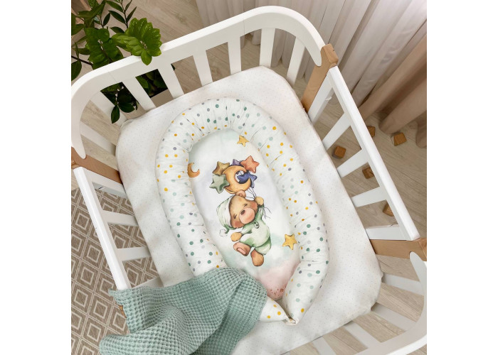 Гніздечко-кокон-це невеликий, ергономічний, плоский матрац з м'якими обмежувальними бортиками по всьому периметру заввишки 10 см. Наповнювач матраца - піна, пружний, сучасний, модифікований матеріал, який рівномірно розподіляє навантаження, завдяки чому малюк почуває себе затишно і комфортно. Чохол матраца пошитий з мікрофібри. Бортики можна стягнути спеціальною ниткою, яка вже вшита в кокон і зафіксувати бантом, таким чином можна зменшувати, або збільшувати розмір кокона-гніздечка.