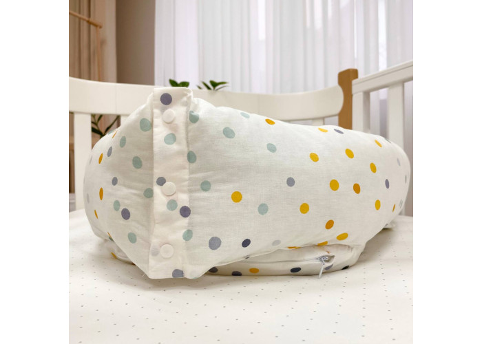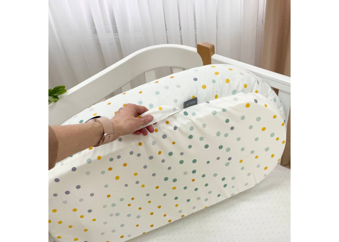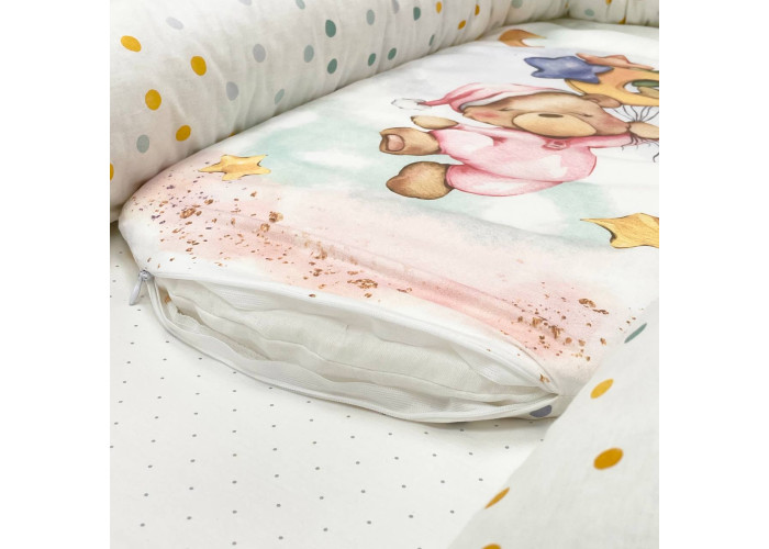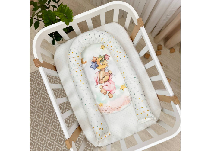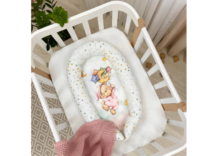 Гніздечко-кокон-це невеликий, ергономічний, плоский матрац з м'якими обмежувальними бортиками по всьому периметру заввишки 10 см. Наповнювач матраца - піна, пружний, сучасний, модифікований матеріал, який рівномірно розподіляє навантаження, завдяки чому малюк почуває себе затишно і комфортно. Чохол матраца пошитий з мікрофібри. Бортики можна стягнути спеціальною ниткою, яка вже вшита в кокон і зафіксувати бантом, таким чином можна зменшувати, або збільшувати розмір кокона-гніздечка.