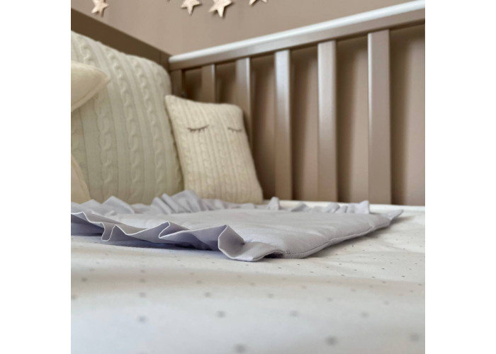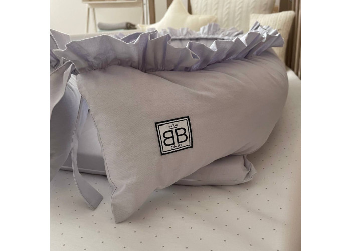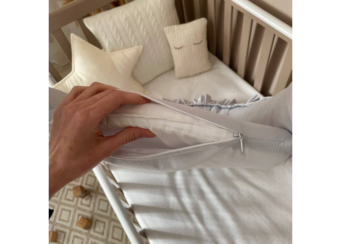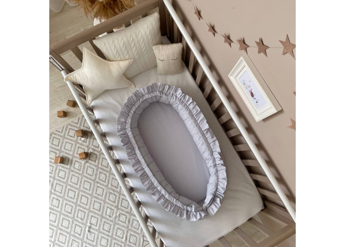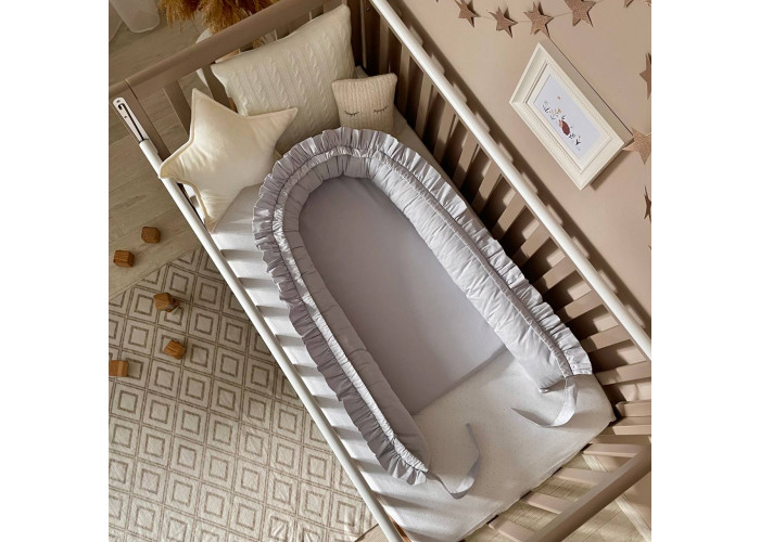Гніздечко-кокон-це невеликий, ергономічний, плоский матрац з м'якими обмежувальними бортиками по всьому периметру заввишки 15 см. Наповнювач матраца - піна, пружний, сучасний, модифікований матеріал, який рівномірно розподіляє навантаження, завдяки чому малюк почуває себе затишно і комфортно. Чохол матраца пошитий з мікрофібри. Наповнювач для бортиків - силіконізоване волокно. Бортики можна стягнути спеціальною ниткою, яка вже вшита в кокон і зафіксувати бантом, таким чином можна зменшувати, або збільшувати розмір кокона-гніздечка. Тканина чохла - натуральна 100% бавовна поплін.