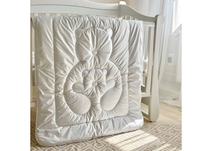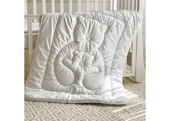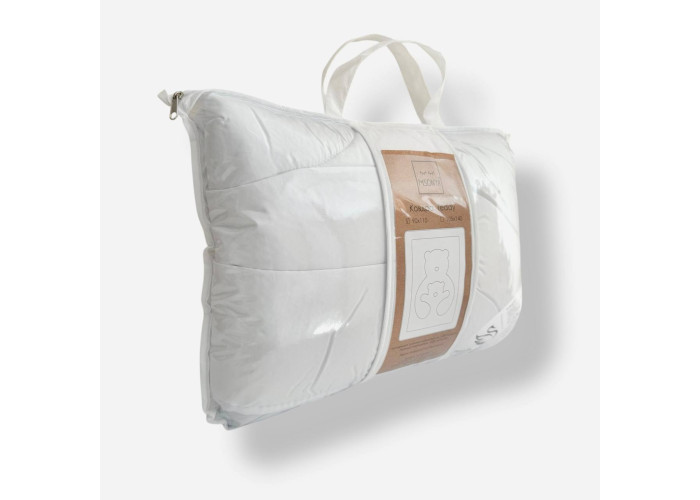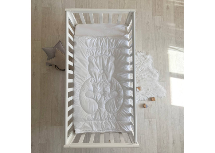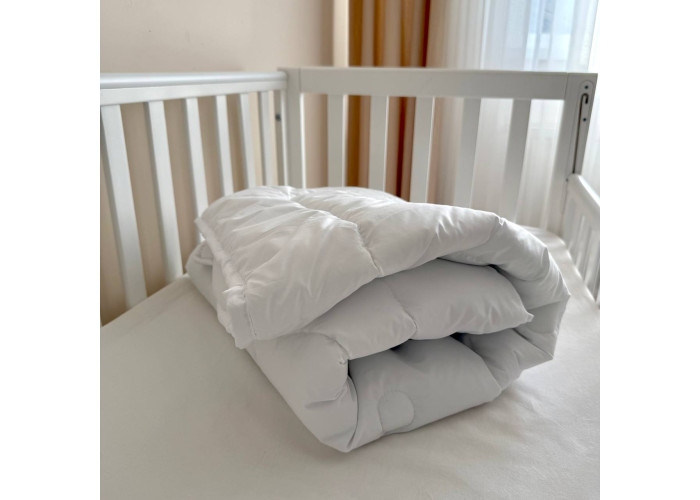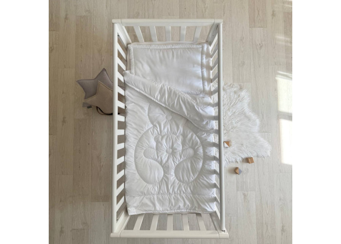 Підходить як для стандартних, так і для овальних ліжечок. Колір: білий. Основний матеріал: каландрована мікрофібра. Матеріал наповнювача ковдри: штучний лебединий пух.