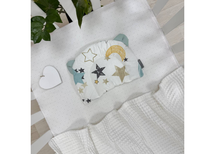 Подушка з вушками призначена для новонароджених дітей та немовлят. Завдяки компактним розмірам, подушечка добре увійде як до дитячого ліжечка, так і до стандартного візочка.