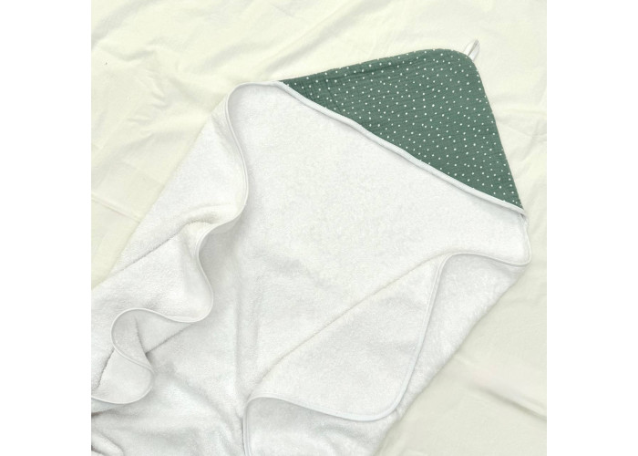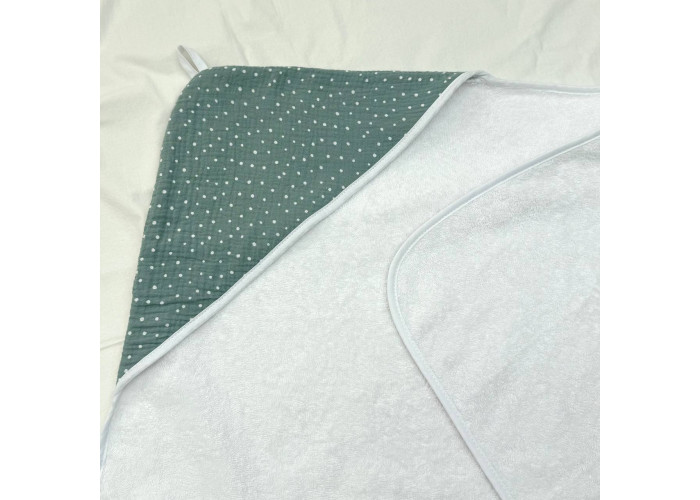 М'який, махровий рушник-куточок з капюшоном,верхня частина капюшона - двостороння (муслін/махра).Рушник з капюшоном ідеально підходить для ніжної чутливої шкіри новонародженого малюка після купання вдома.