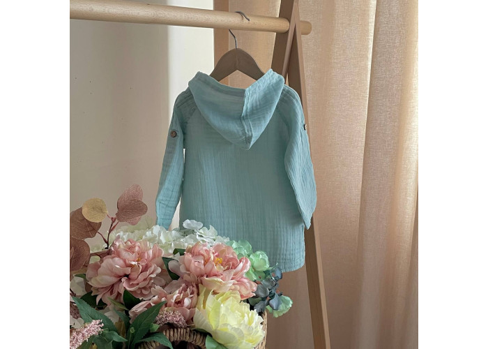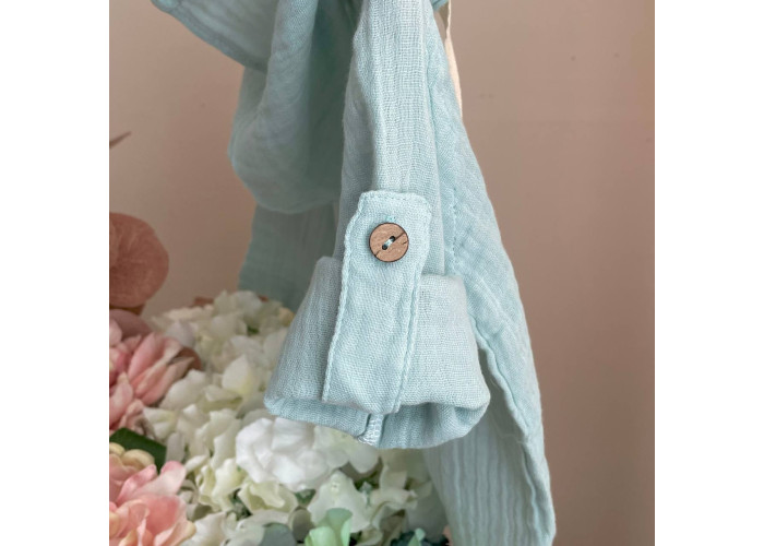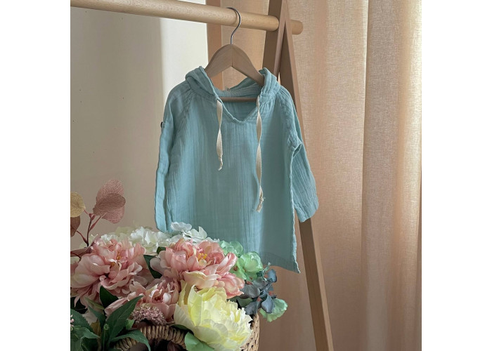 М'яка, приємна на дотик і комфортна туніка виконана з легкого, невагомого та міцного матеріалу - мусліну. Така туніка не парить, не сковує рухів. Її можна носити як захист від сонця, як сорочку під шорти або штанці, або використовувати як халатик після купання. Довжина рукава регулюється завдяки підворотам на гудзику, по горловині передбачено шнурівку.
