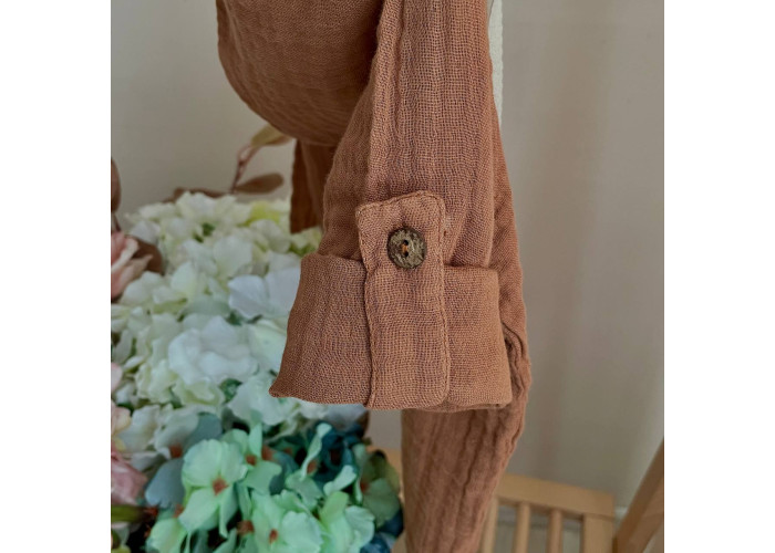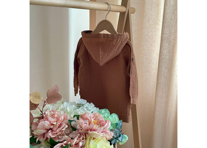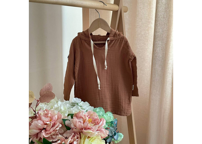 М'яка, приємна на дотик і комфортна туніка виконана з легкого, невагомого та міцного матеріалу - мусліну. Така туніка не парить, не сковує рухів. Її можна носити як захист від сонця, як сорочку під шорти або штанці, або використовувати як халатик після купання. Довжина рукава регулюється завдяки підворотам на гудзику, по горловині передбачено шнурівку.