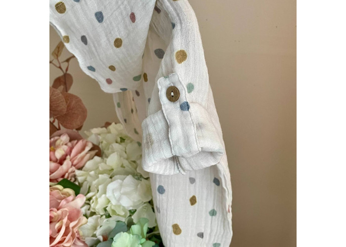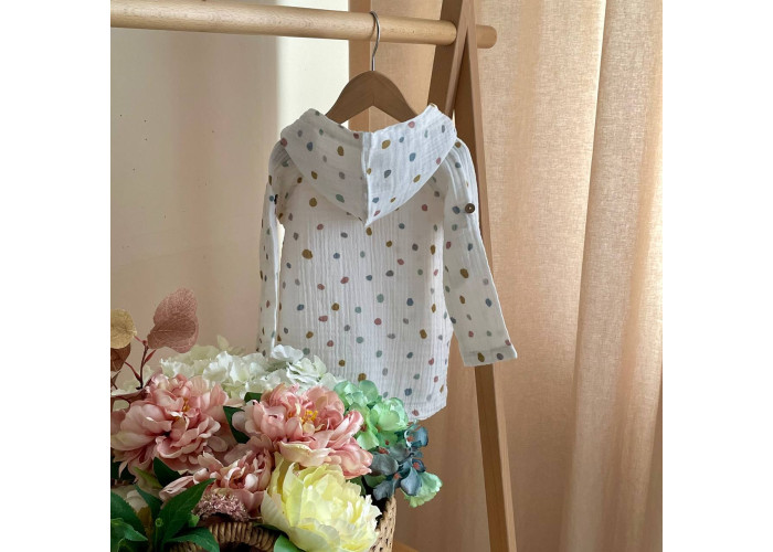 М'яка, приємна на дотик і комфортна туніка виконана з легкого, невагомого та міцного матеріалу - мусліну. Така туніка не парить, не сковує рухів. Її можна носити як захист від сонця, як сорочку під шорти або штанці, або використовувати як халатик після купання. Довжина рукава регулюється завдяки підворотам на гудзику, по горловині передбачено шнурівку.