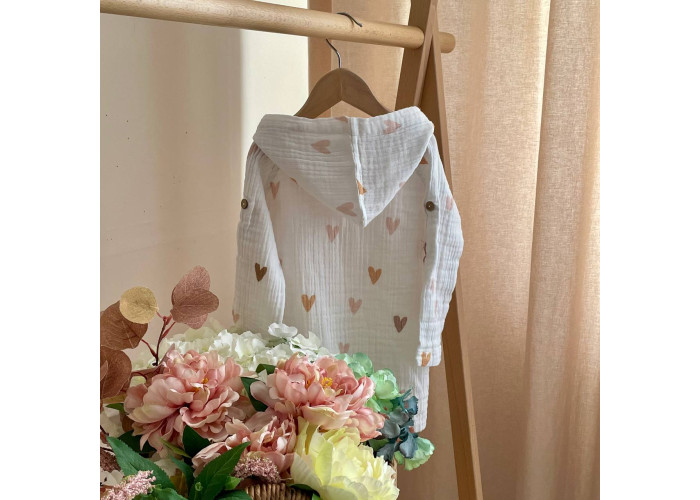 М'яка, приємна на дотик і комфортна туніка виконана з легкого, невагомого та міцного матеріалу - мусліну. Така туніка не парить, не сковує рухів. Її можна носити як захист від сонця, як сорочку під шорти або штанці, або використовувати як халатик після купання. Довжина рукава регулюється завдяки підворотам на гудзику, по горловині передбачено шнурівку.