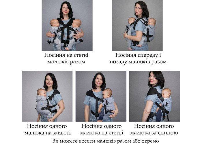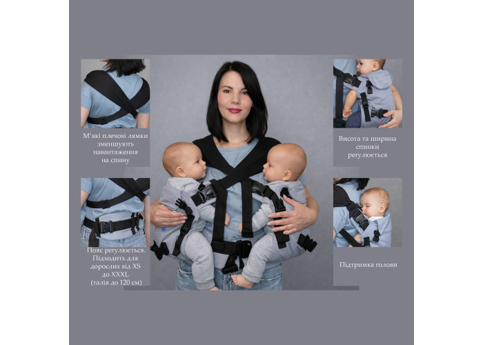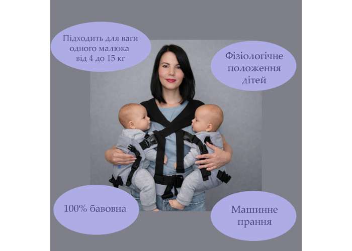 Насолоджуйтесь часом, проведеним з обома вашими малюками!Цей універсальний ерго рюкзак для двійні розроблений для того, щоб ваші малюки були поруч, у безпеці та комфорті, а ви вільно рухалися. 5 способів перенесення Використовуйте як подвійний ерго рюкзак або як два окремих ерго рюкзака. Носіть своїх малюків спереду, ззаду або на боці. Гнучкі варіанти для різного віку та ситуацій. Зростає разом з вашими малюками, адже має регульовану висоту та ширину спинок.Підходить для кожної дитини вагою від 4 кг до 15 кг. Максимальна загальна вага для перенесення близнюків: 30 кг. Ергономічне сидіння в M-подібному положенні Підтримує здоровий розвиток стегон та хребта, рекомендований педіатрами. М’які плечові ремені з м’якою підкладкою та широка поперекова підтримка зменшують навантаження на спину батьків. Високоякісні матеріали Виготовлений зі 100% бавовняного твілу - м’який, дихаючий та ніжний до шкіри дитини. Підходить для всіх типів фігури дорослих.Регульований поясний ремінь підходить для розмірів від XS до XXXL (талія до 120 см). Розроблено для мам і тат будь-якої статури. Важливо. Діти завжди повинні бути повернуті обличчям до вас.Проконсультуйтеся з лікарем, якщо у вас є якісь проблеми зі здоров'ям або занепокоєння щодо носіння близнюків.
