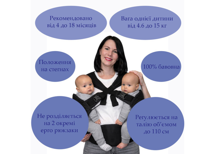 Цей ерго рюкзак для близнюків призначений лише для носіння дітей на стегнахДіти повинні завжди перебувати обличчям до дорослогоУвага: цей рюкзак не розділяється на два окремі рюкзаки