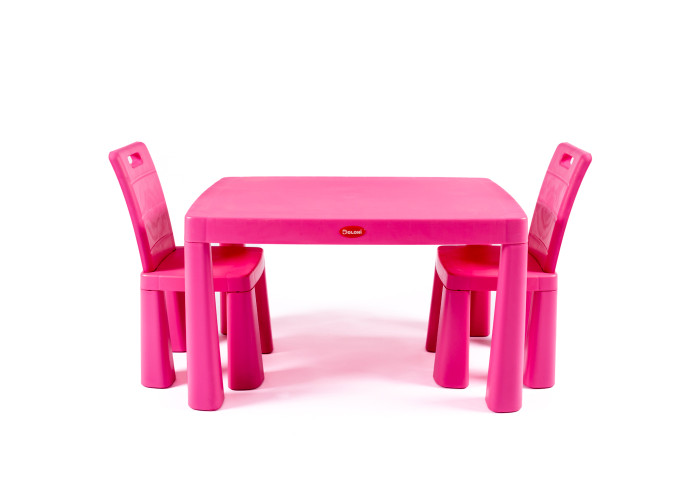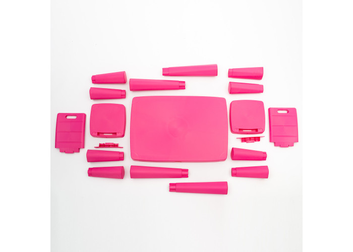 Комплект рожевого кольору складається з дитячого столу з пластику, а також з двох дитячих стільців, так само з пластику. Дитячі стільці, так само можна використовувати як табурет. У даній моделі повністю знімається спинка і замість спинки можна поставити заглушку, яка є в комплекті.